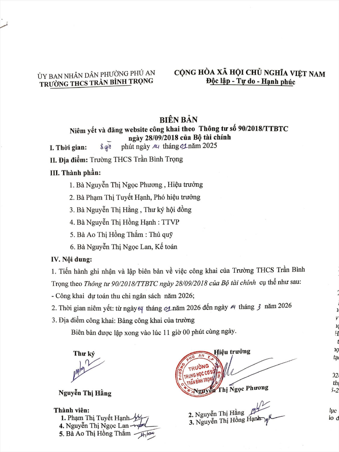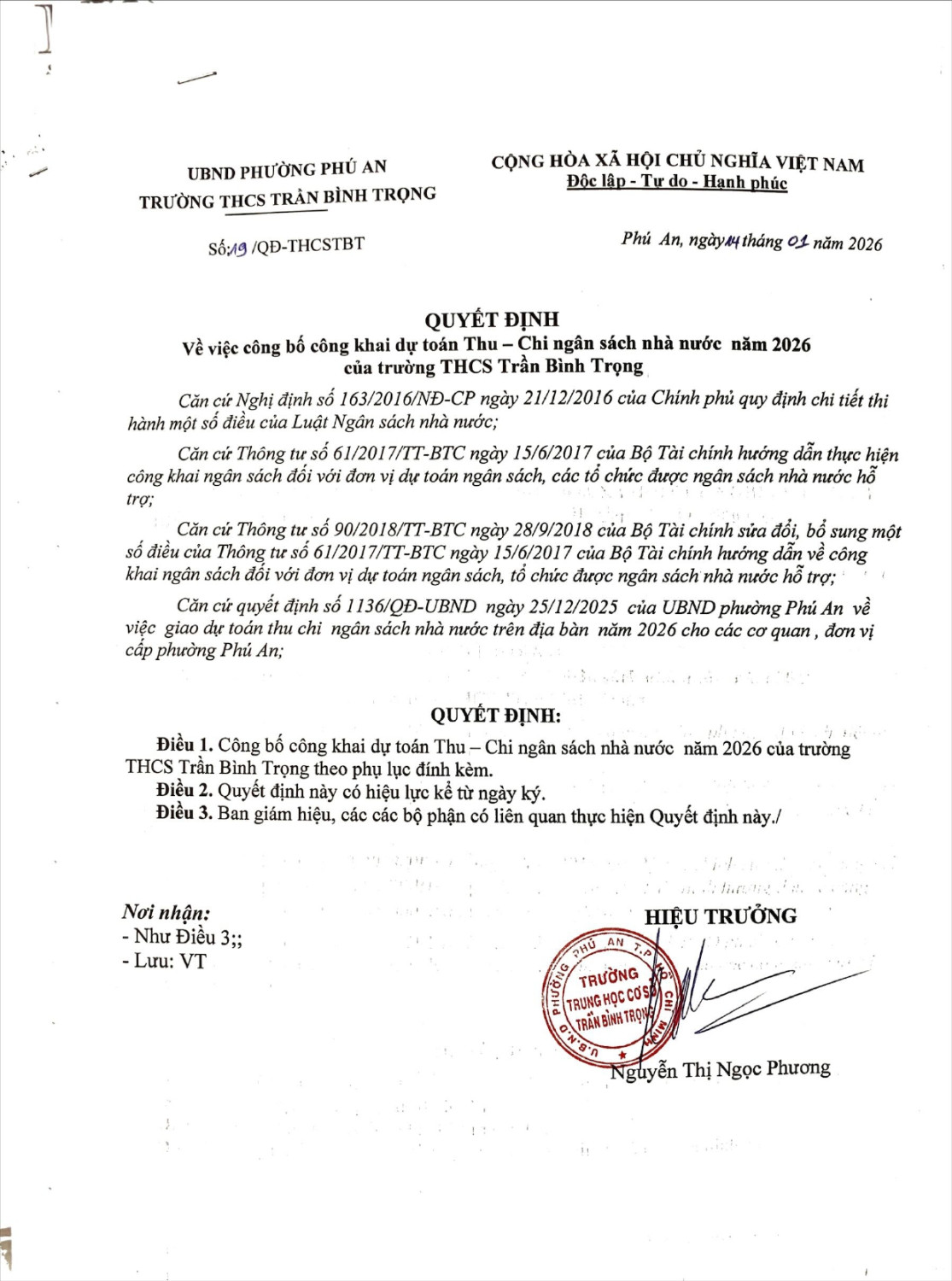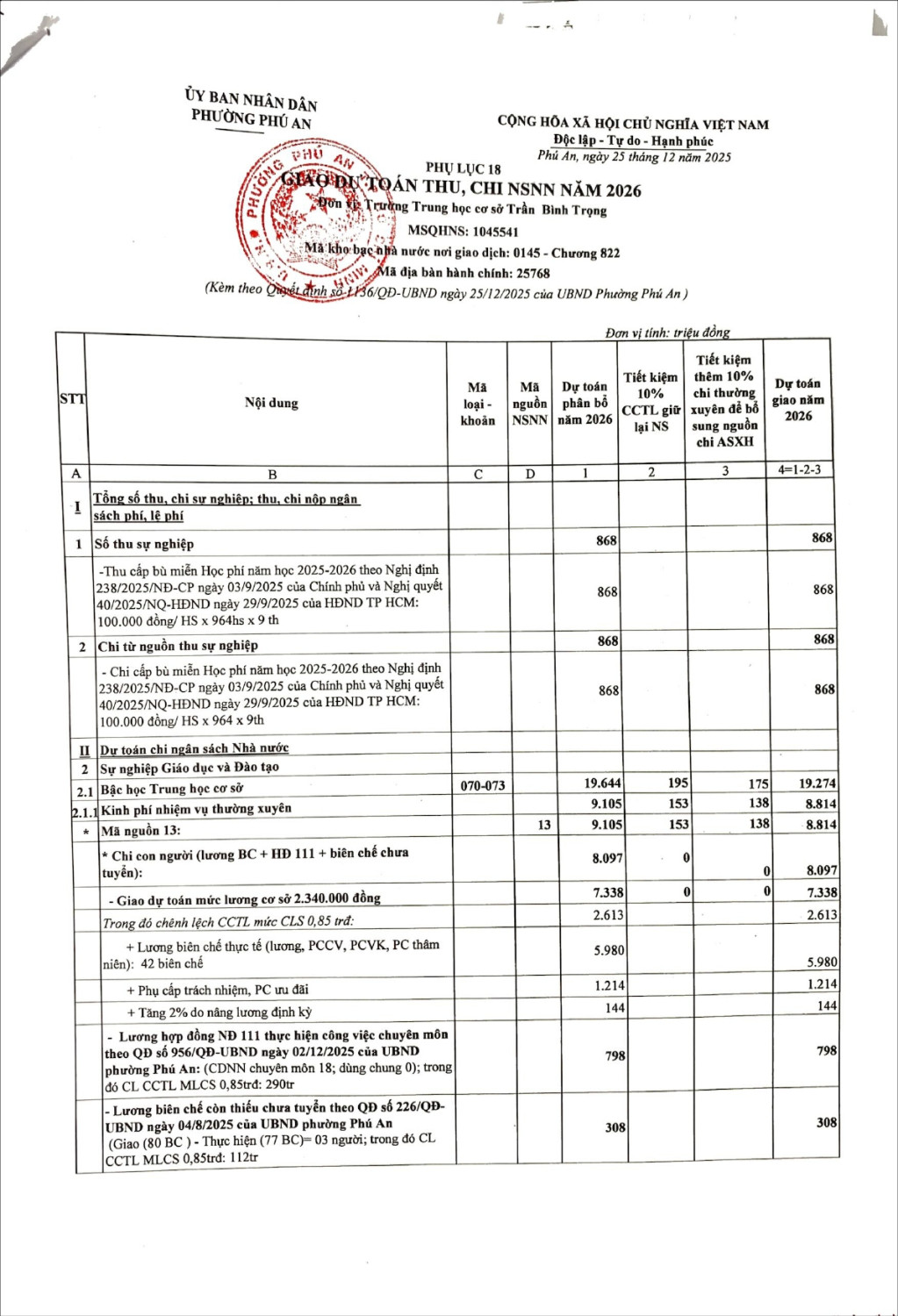 Trường THCS Trần Bình Trọng công khai dự toán ngân sách năm 2026