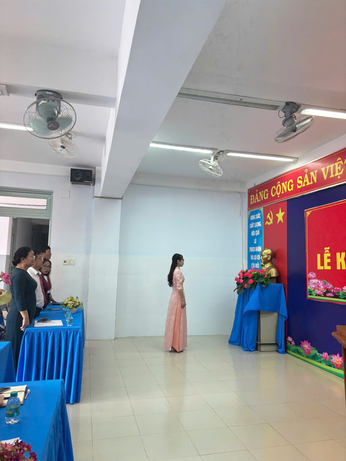 Tại buổi lễ, Đồng chí Nguyễn Thị Ngọc Phương - Bí thư Chi bộ - Hiệu trưởng nhà trường đọc quyết định kết nạp Đảng viên mới và phát biểu chúc mừng đồng thời giao nhiệm vụ cho đồng chí Quỳnh Vân. Mong rằng đồng chí tiếp tục phát huy phẩm chất và năng lực góp phần xây dựng Chi bộ nhà trường ngày càng phát triển vững mạnh.