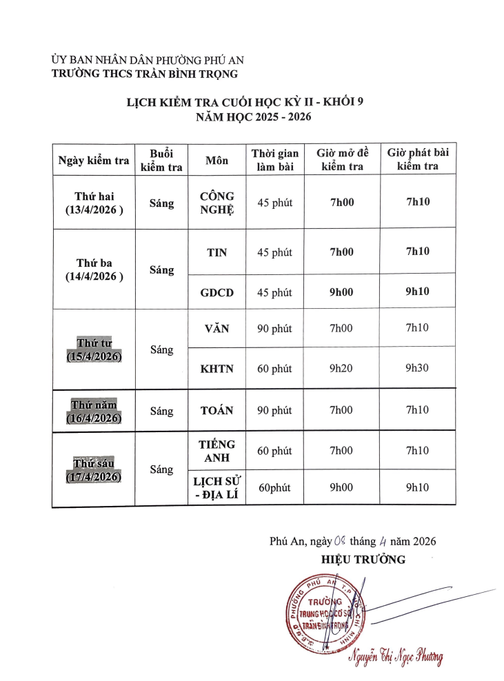 Lịch kiểm tra HK2_Khối 9_Năm học 2025-2026