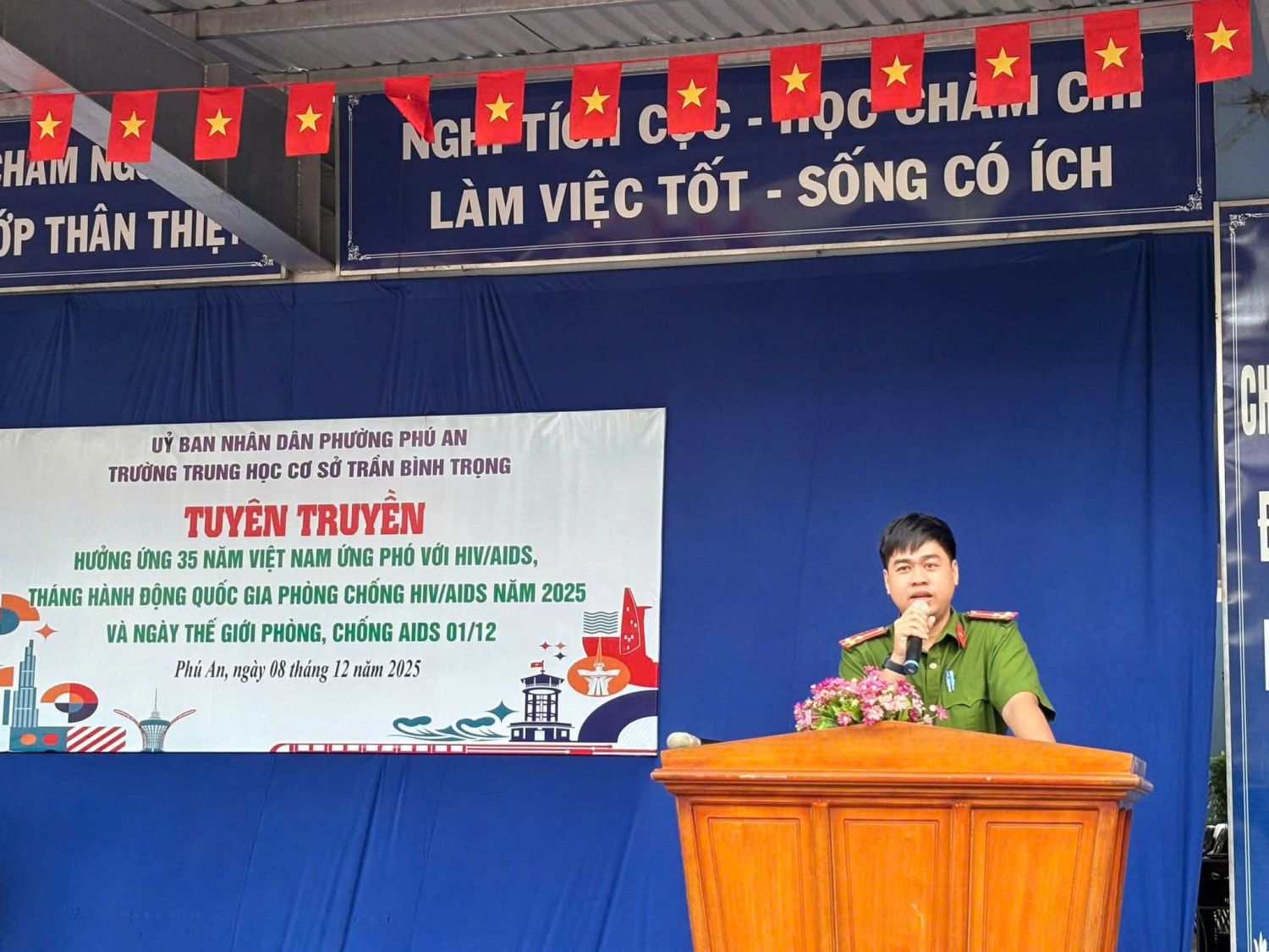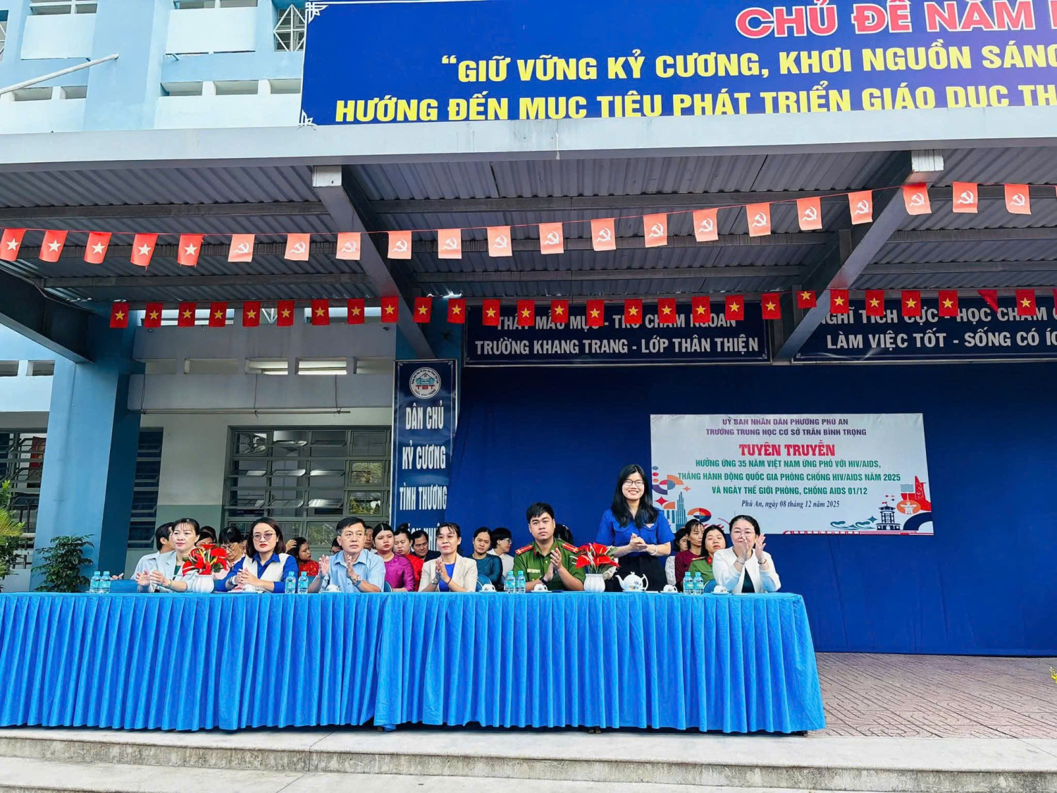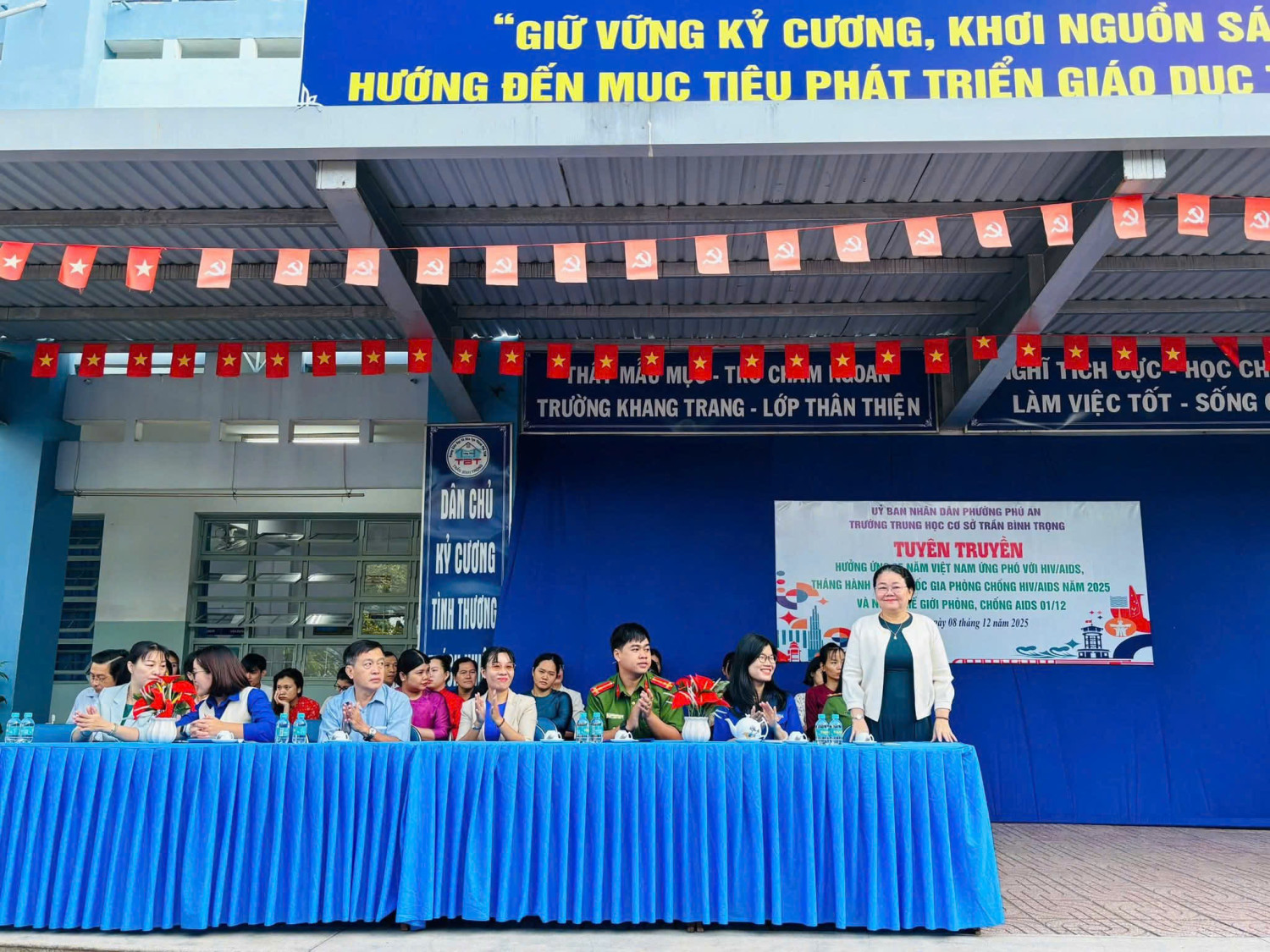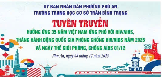 Sáng ngày 08 tháng 12 năm 2025 Trường THCS Trần Bình Trọng phối kết hợp cùng Đoàn phường Phú An tổ chức tuyên truyền hưởng ứng 35 năm Việt Nam ứng phó với HIV/AIDS, tháng hành động Quốc Gia phòng chống HIV/AIDS năm 2025 và ngày Thế giới phòng, chống AIDS 01/12 cho các em học sinh.