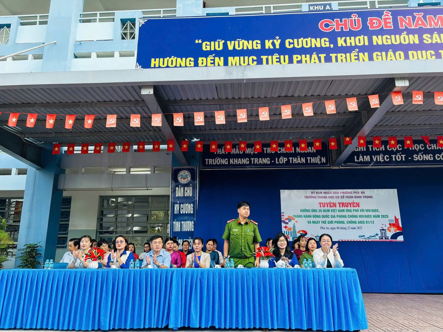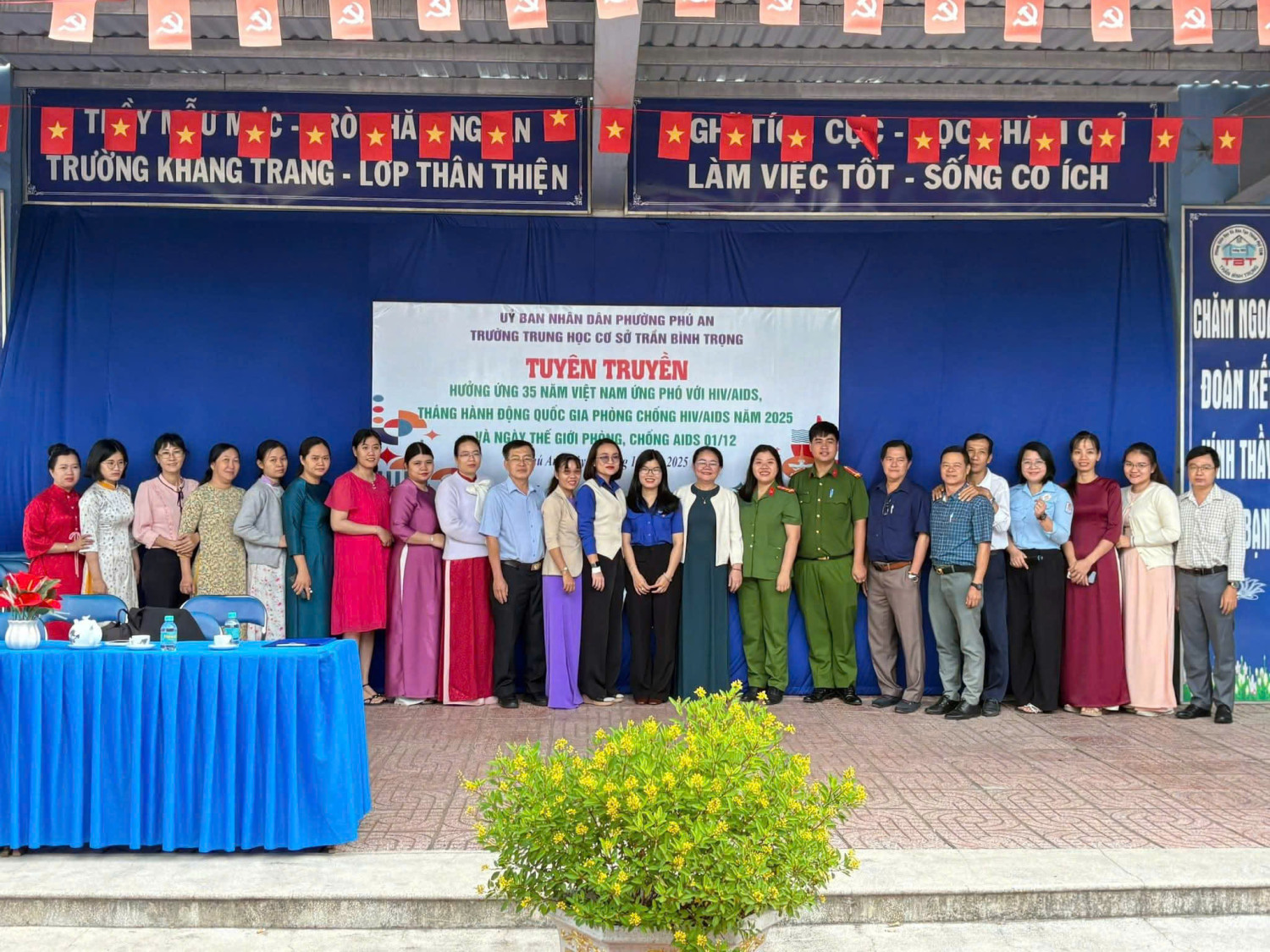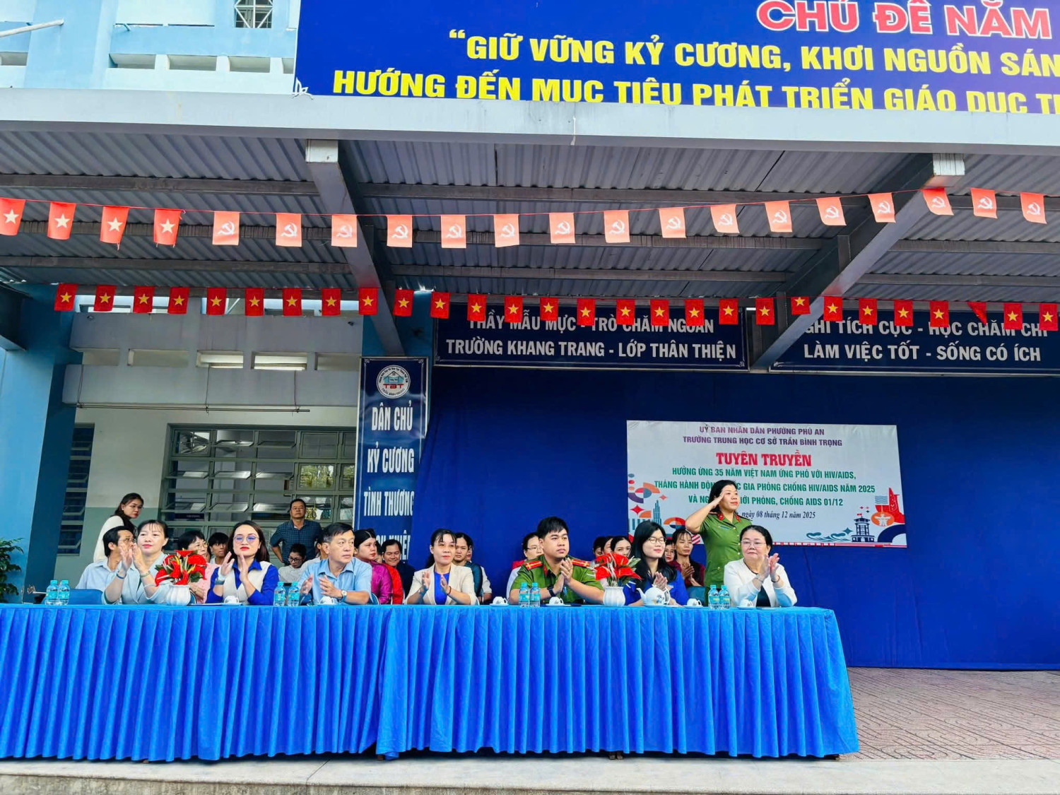 Sáng ngày 08 tháng 12 năm 2025 Trường THCS Trần Bình Trọng phối kết hợp cùng Đoàn phường Phú An tổ chức tuyên truyền hưởng ứng 35 năm Việt Nam ứng phó với HIV/AIDS, tháng hành động Quốc Gia phòng chống HIV/AIDS năm 2025 và ngày Thế giới phòng, chống AIDS 01/12 cho các em học sinh.