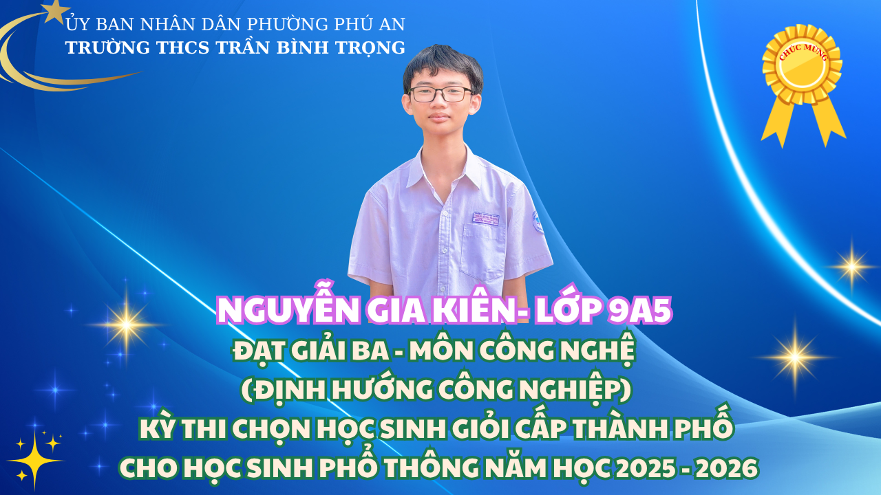🥉 Nguyễn Gia Kiên (Lớp 9A5) – Giải Ba môn Công nghệ (Định hướng Công nghiệp)